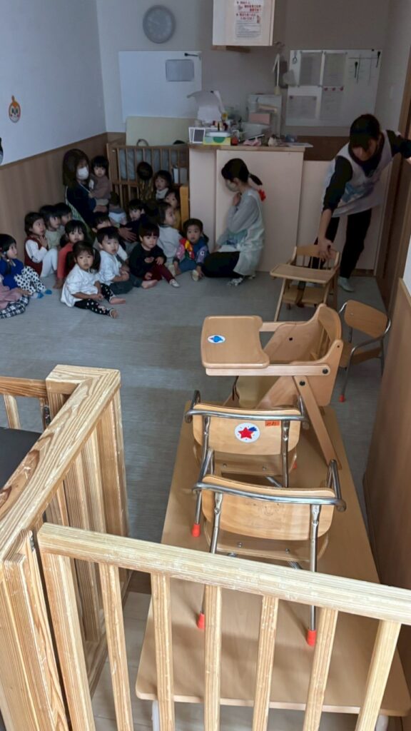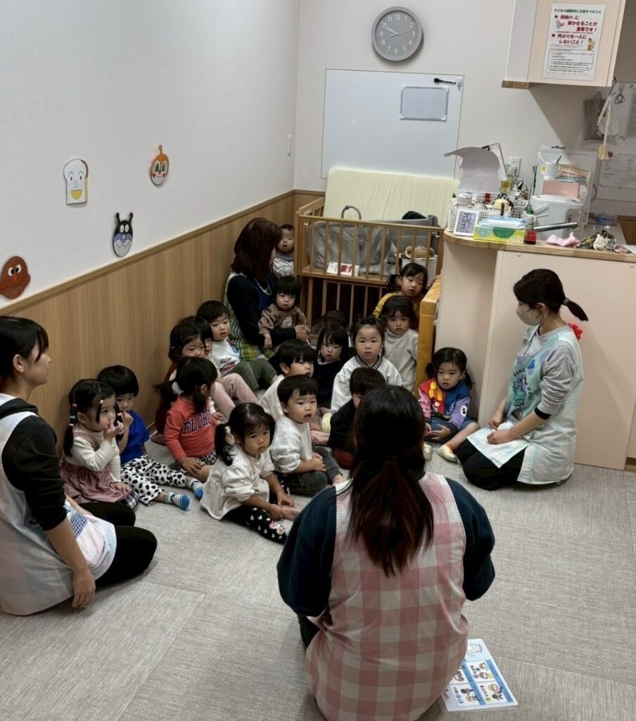こどもたちは担任の先生と一緒に奥の保育室へ避難しました。
