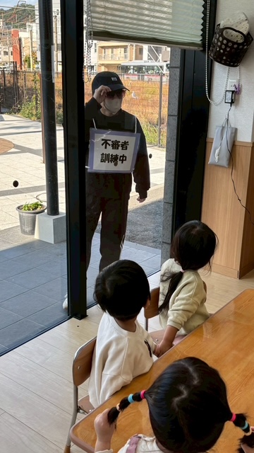 (不審者を絶対に園内に入れない、未然に防ぐことが何より大事ですが今回は万が一入ってしまった時のことを想定して訓練しています)