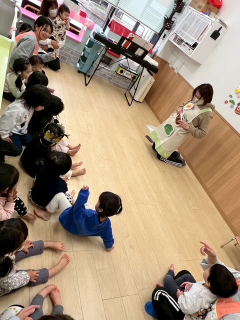 最後に『はらぺこあおむし』のエプロンシアターを見て🐛🍎🍭🧀
