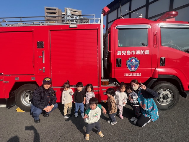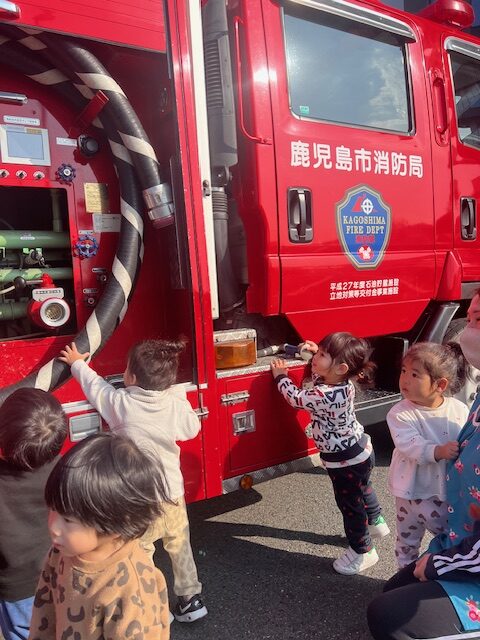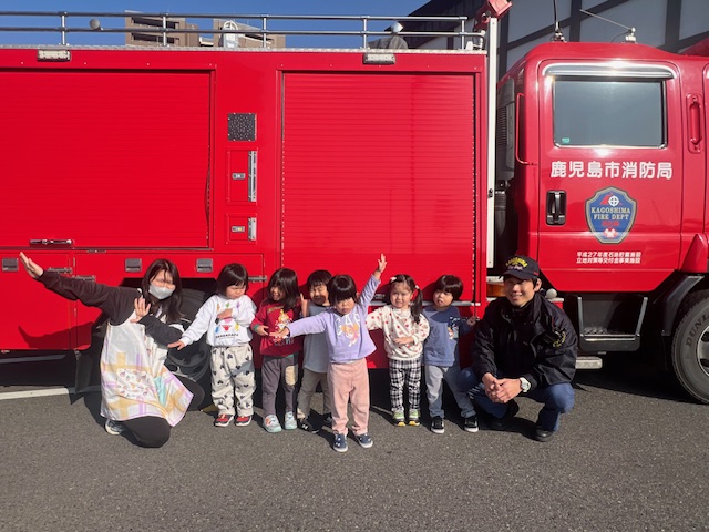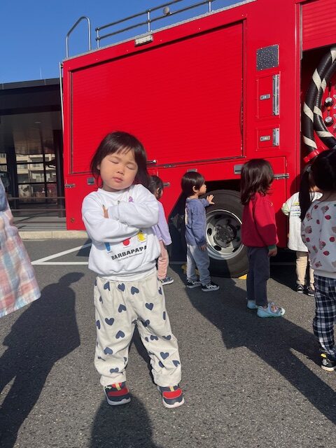 子どもたちが大好きな消防車と一緒に各クラス写真を撮ったあとは