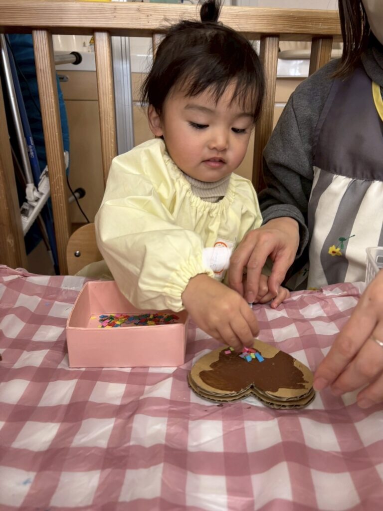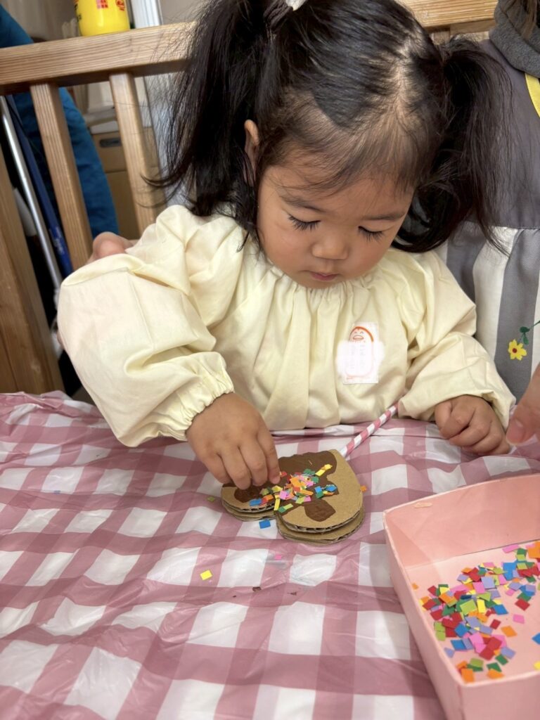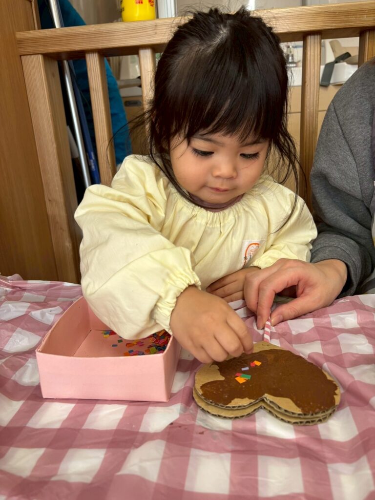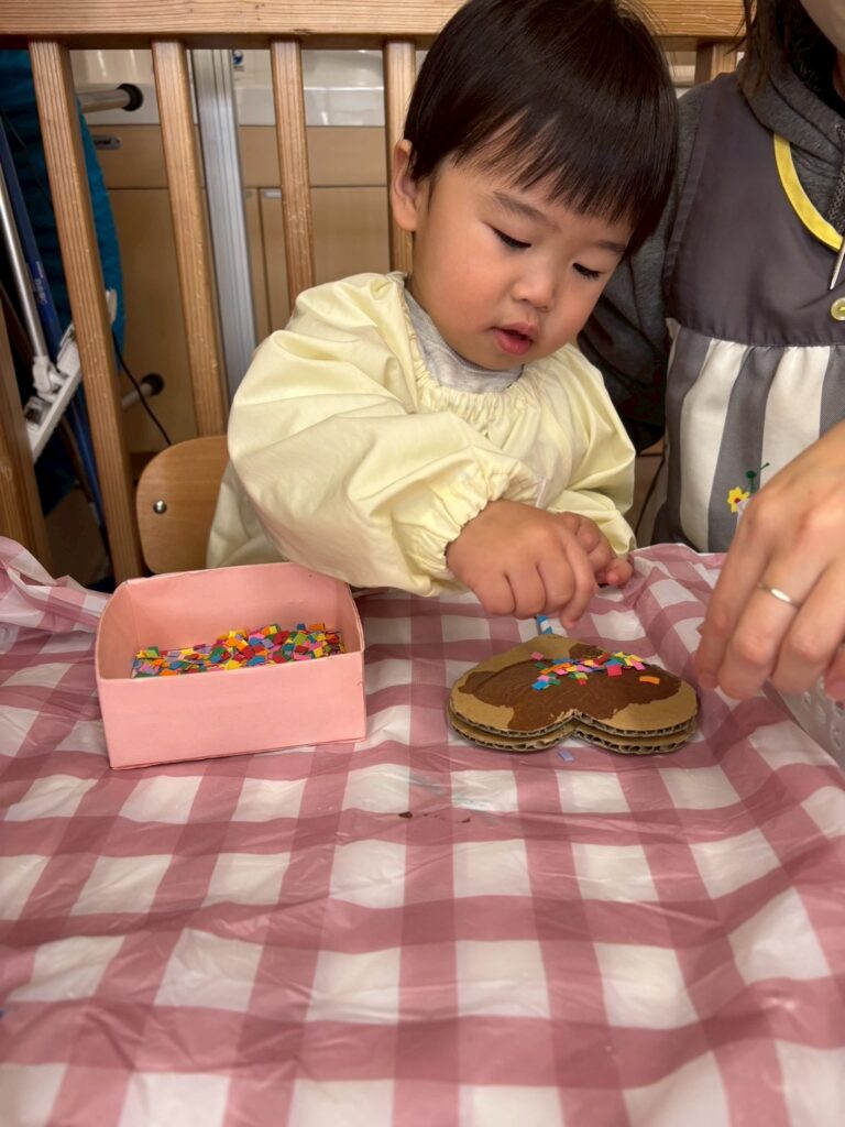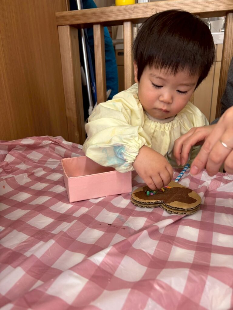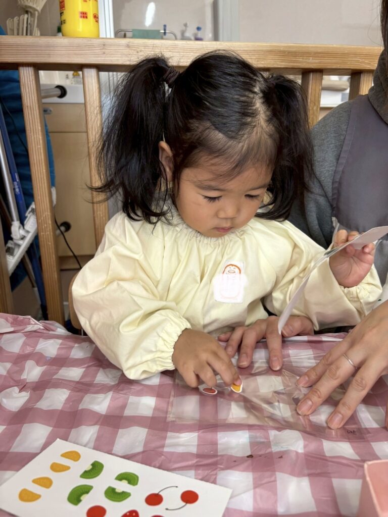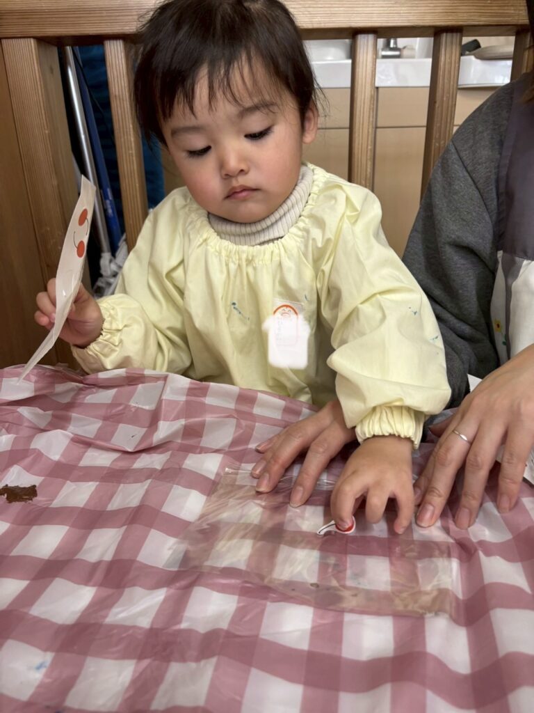 最後にラッピングの袋に果物シールをペタペタ🍓🥝🍊🍒