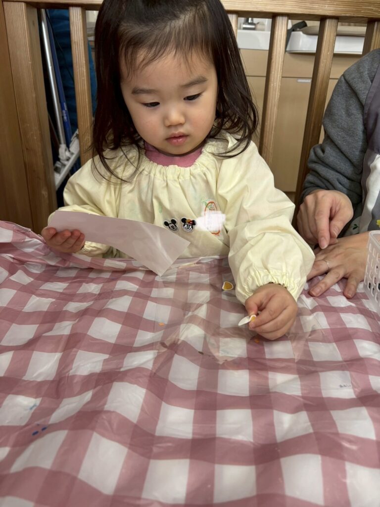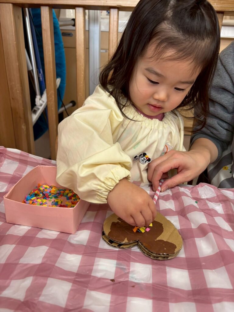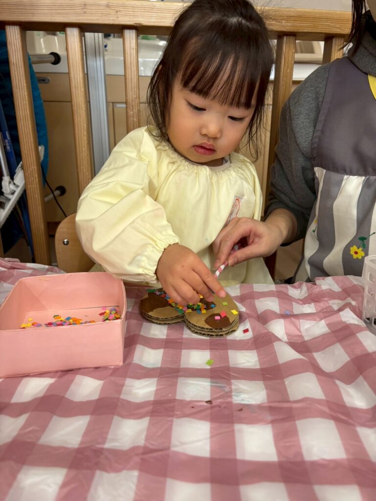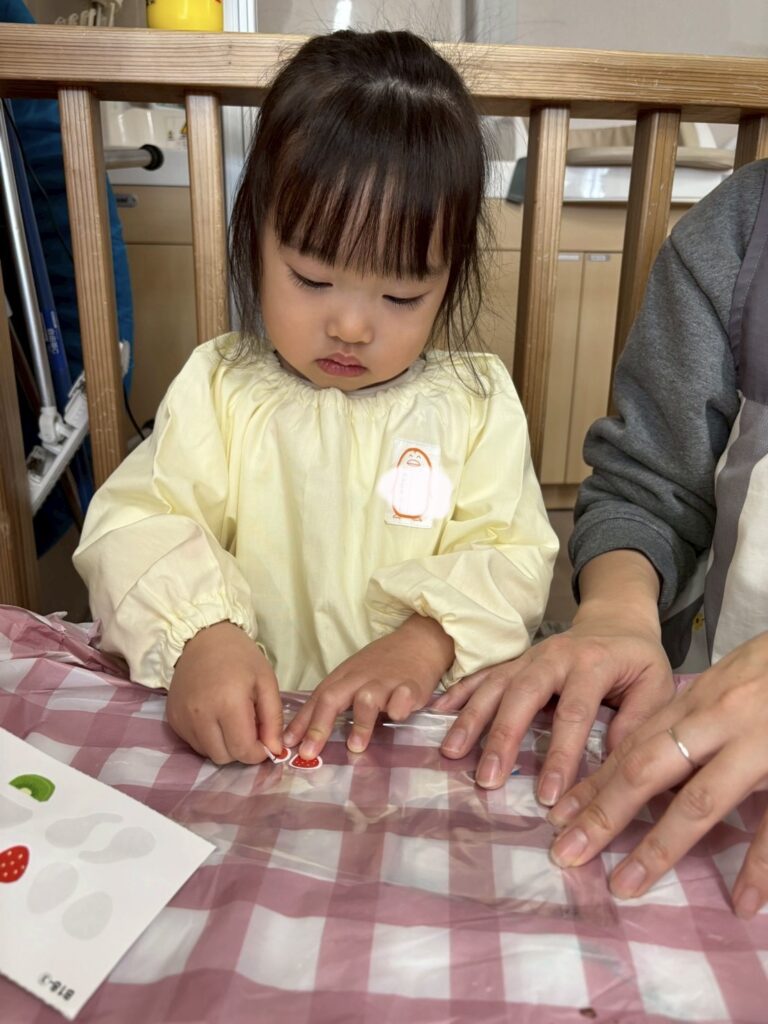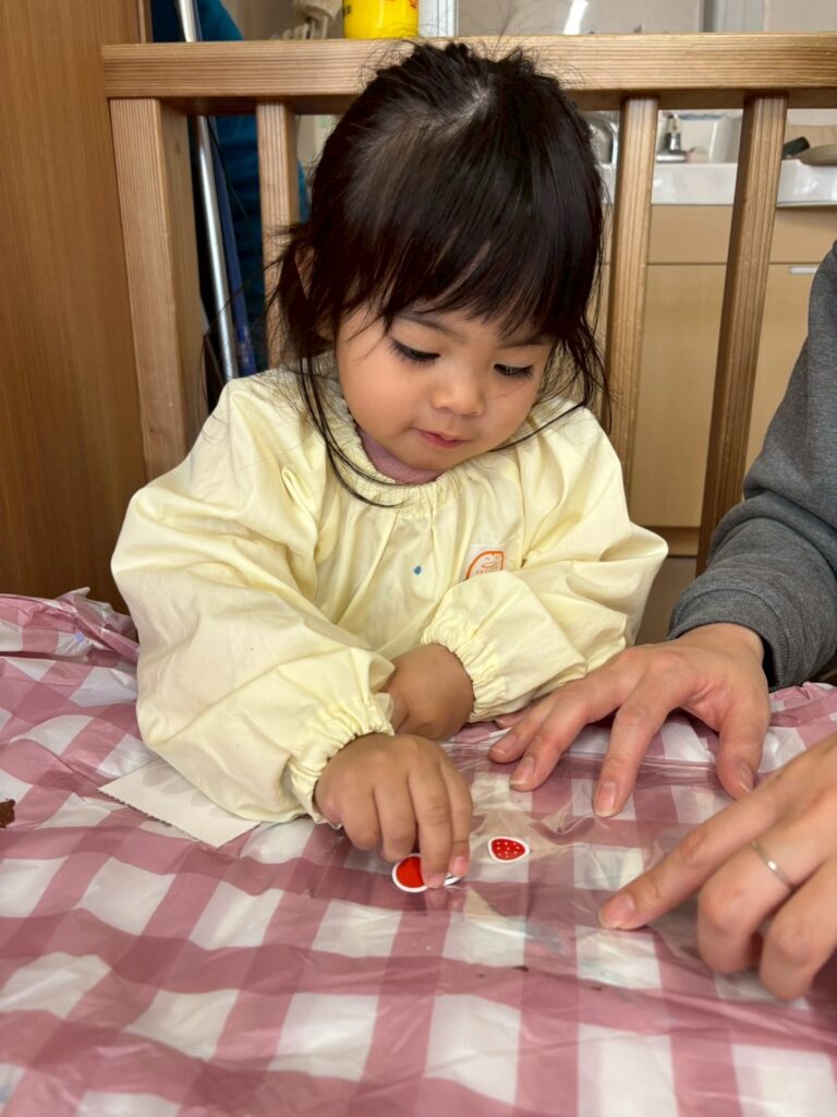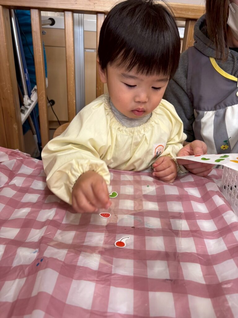 最後にラッピングの袋に果物シールをペタペタ🍓🥝🍊🍒